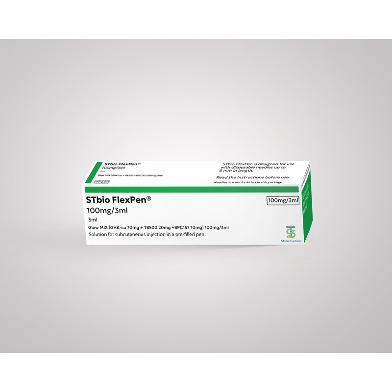 GLOW MIX - инновационный пептидный комплекс от ST Biotechnology в удобной форме FlexPen (100 мг/3 мл), объединяющий три ключевых компонента: GHK-Cu (70 мг), TB500 (20 мг) и BPC-157 (10 мг). Препарат разработан для выраженной синергетической стимуляции процессов тканевой регенерации, восстановления кожного барьера и системного заживления тканей во всём теле. Его ключевая особенность - мощное взаимодействие компонентов, создающее комплексный эффект регенерации и улучшения качества жизни за счёт одновременной стимуляции репарации, ангиогенеза и антиоксидантной защиты.